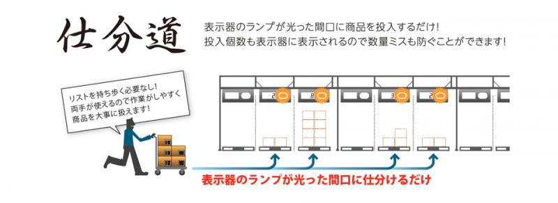 デジタルアソートシステム仕分道は物流センターの現場・倉庫にて行われる「仕分け作業」を誰でも・簡単・正確に行う ためのシステムです。 仕分けする棚に表示器を設置。表示器が点灯した棚にデジタル画面に表示される個数だけ商品を仕分けしていきます。 仕分けリストを確認しながらの仕分け作業に比べスピーディーに業務を行えます。