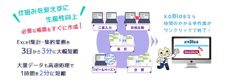 xoBlosは以下の機能を駆使し、Excel・csv・DB等の異なるデータの集計・分類やレポート作成、システム間連携用のデータ作成を自動化します。