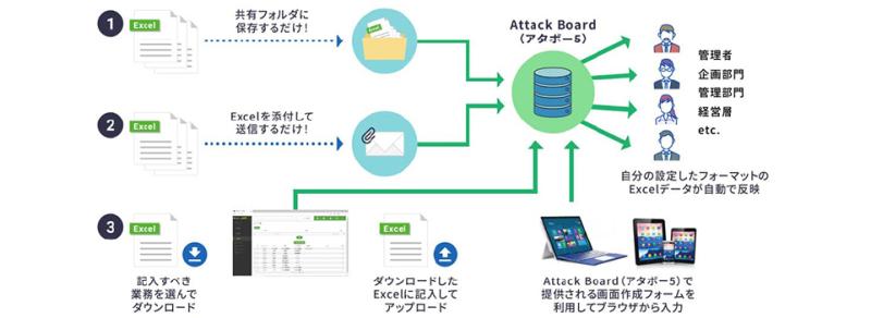 「集計名人アタボー5®」は、ご利用中のエクセル書式のまま、データを収集、集計、加工作業を効率化する仕組みをご提供する、クラウド型データアグリゲーションツールです。